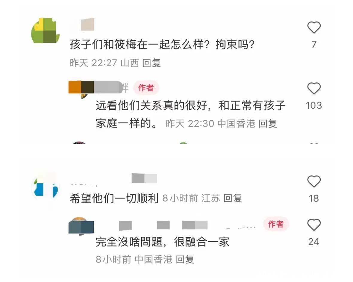 镜头前的一家四口温馨和谐,偶遇他们的网友都给出的是很正面的评价——“关系真的很好”、“很融合的一家”。
